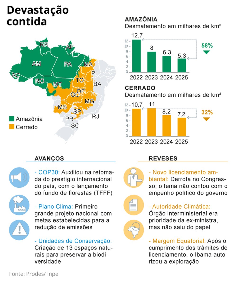Na comparação entre 2022 e 2025,o desmatamento na Amazônia caiu 58%,e no Cerrado,32%. Em coletiva na última quarta-feira para oficializar a passagem do bastão para seu secretário-executivo,João Capobianco,Marina ressaltou que os números são “fruto do trabalho” do Ibama,do ICMBio e da Polícia Federal (PF).