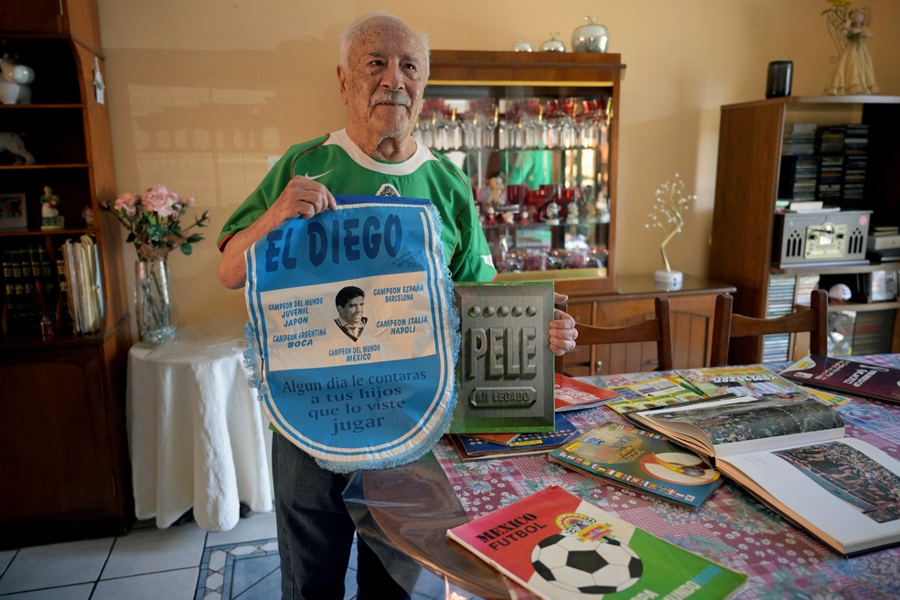 O mexicano Fernando Rueda,de 86 anos,aposentado e fã de futebol,mostra lembranças de Copas do Mundo anteriores — Foto: Alfredo Estrella / AFP