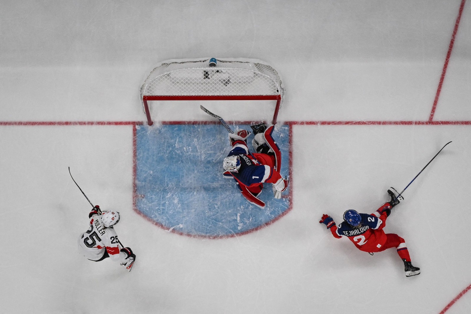 A atacante suíça no 25,Alina Muller (E),chuta e marca o segundo gol de sua equipe durante a partida da fase preliminar do Grupo A do hóquei no gelo feminino entre República Tcheca e Suíça,na Arena de Hóquei no Gelo Milano Santagiulia,nos Jogos Olímpicos de Inverno de Milão-Cortina 2026,em Milão,em 6 de fevereiro de 2026. — Foto: Wikus de WET / AFP