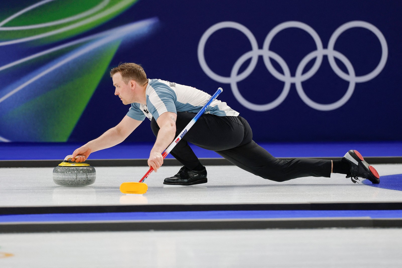O norueguês Magnus Nedregotten lança a pedra no torneio de duplas mistas de curling entre Suécia e Noruega durante os Jogos Olímpicos de Inverno de Milão-Cortina 2026,em 6 de fevereiro de 2026. — Foto: Odd ANDERSEN / AFP