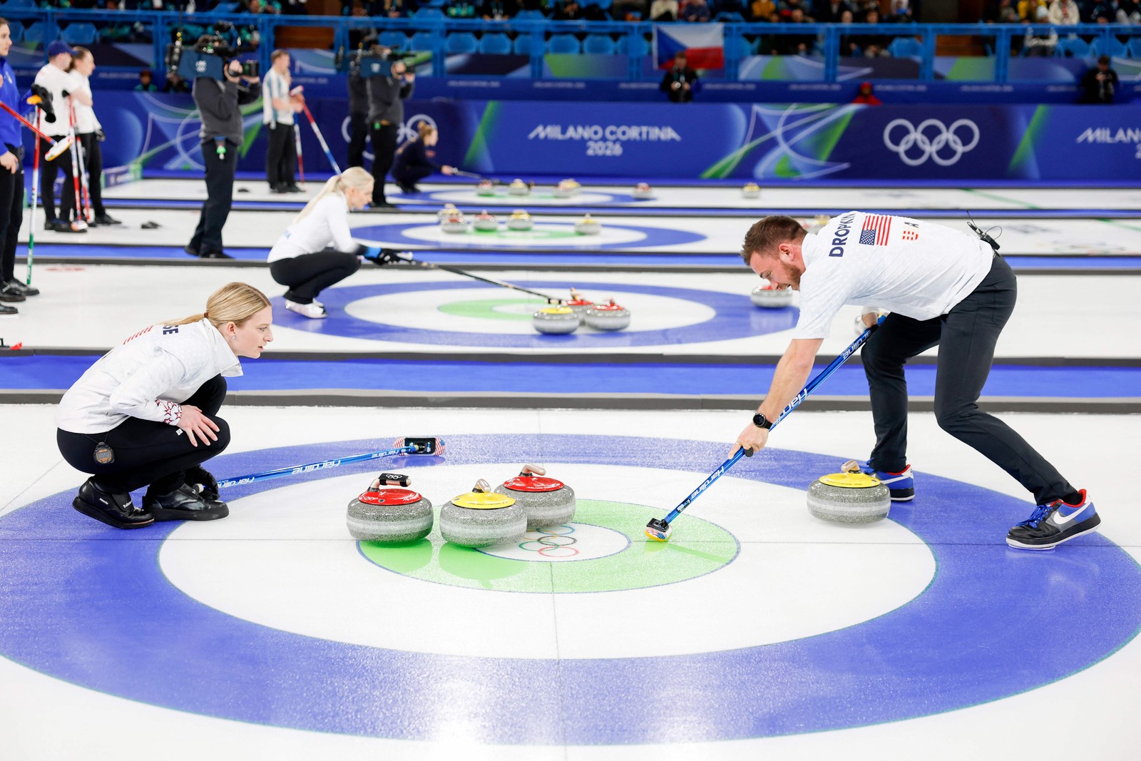 Os americanos Korey Dropkin (à direita) e Cory Thiesse (à esquerda) competem na fase de grupos de duplas mistas de curling entre a República Tcheca e os Estados Unidos durante os Jogos Olímpicos de Inverno de Milão-Cortina 2026,em 6 de fevereiro de 2026. — Foto: Odd ANDERSEN / AFP