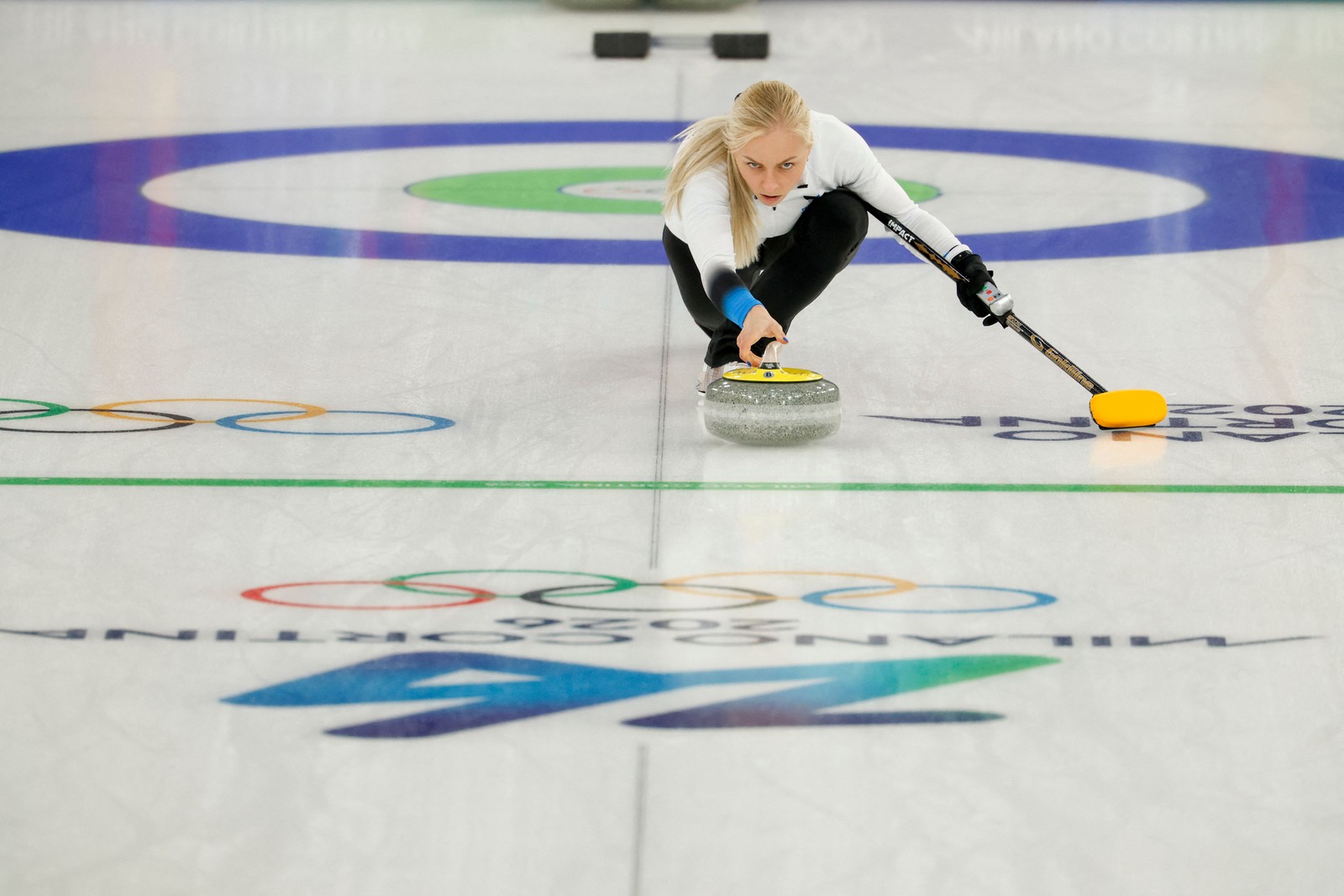A estoniana Marie Kaldvee lança a pedra no torneio de duplas mistas de curling entre Itália e Estônia durante os Jogos Olímpicos de Inverno de Milão-Cortina 2026,em 6 de fevereiro de 2026. — Foto: Odd ANDERSEN / AFP