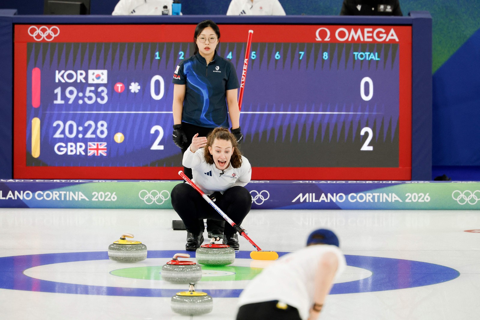 A britânica Jennifer Dodds (C) gesticula em direção ao seu companheiro de equipe,o também britânico Bruce Mouat,durante a partida de curling de duplas mistas entre Coreia do Sul e Grã-Bretanha nos Jogos Olímpicos de Inverno de Milão-Cortina 2026,em 6 de fevereiro de 2026. — Foto: Odd ANDERSEN / AFP