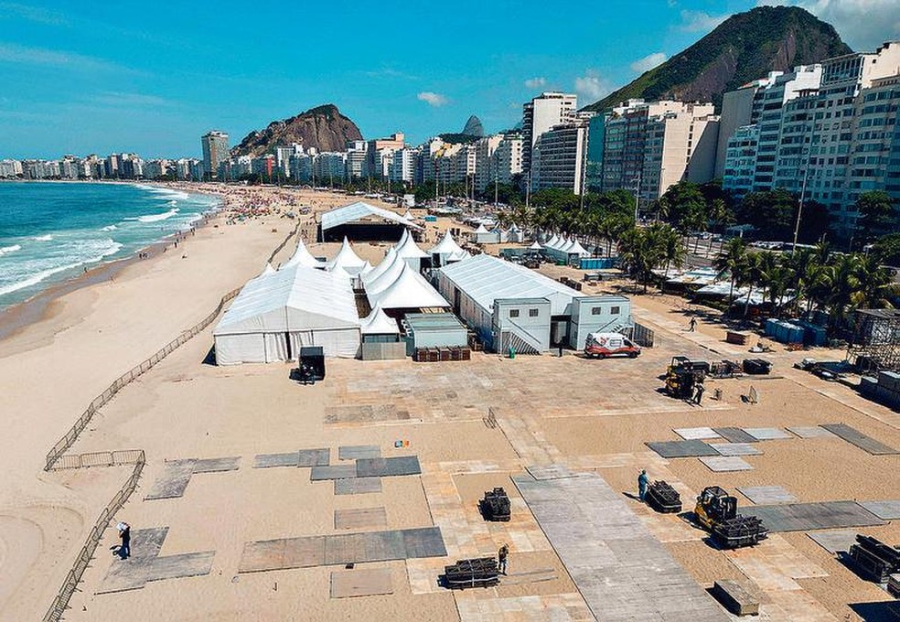Na praia,estão sendo instalados 32 telões de 500 metros quadrados e 16 torres de luz,em formato que repete a estrutura oferecida para Lady Gaga.