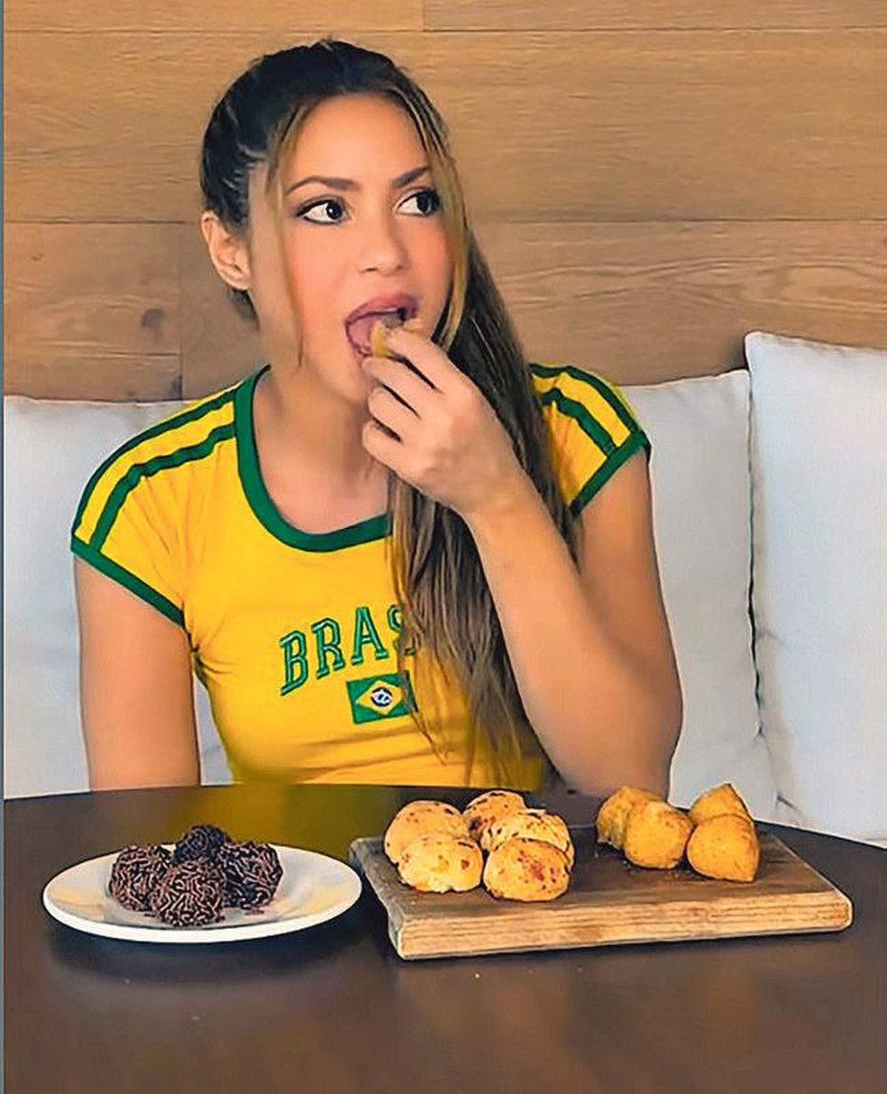 Enquanto um exército de quatro mil pessoas trabalha,no Rio,nos preparativos para o show de Shakira,a pop star colombiana entrou no clima da contagem regressiva para o megaevento — e tratou de já reforçar as energias para subir ao palco. Em vídeo publicado nas redes sociais,a cantora aparece vestindo a camisa da seleção brasileira diante de três iguarias nacionais: coxinha,brigadeiro e pão de queijo.
