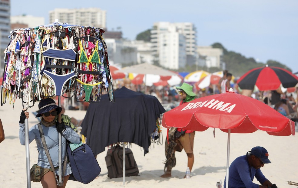Vendedora ambulante na Praia de Ipanema expõe biquínis em guarda-sol com peças penduradas — Foto: Marcelo Theobald/Agência O Globo