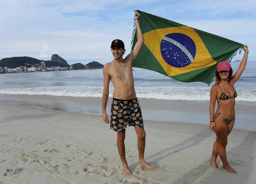 Brazilcore na veia. Canga de bandeira nacional dos amigos Herbert Alves e Anny Granato,em Copacabana — Foto: Marcelo Theobald/Agência O Globo