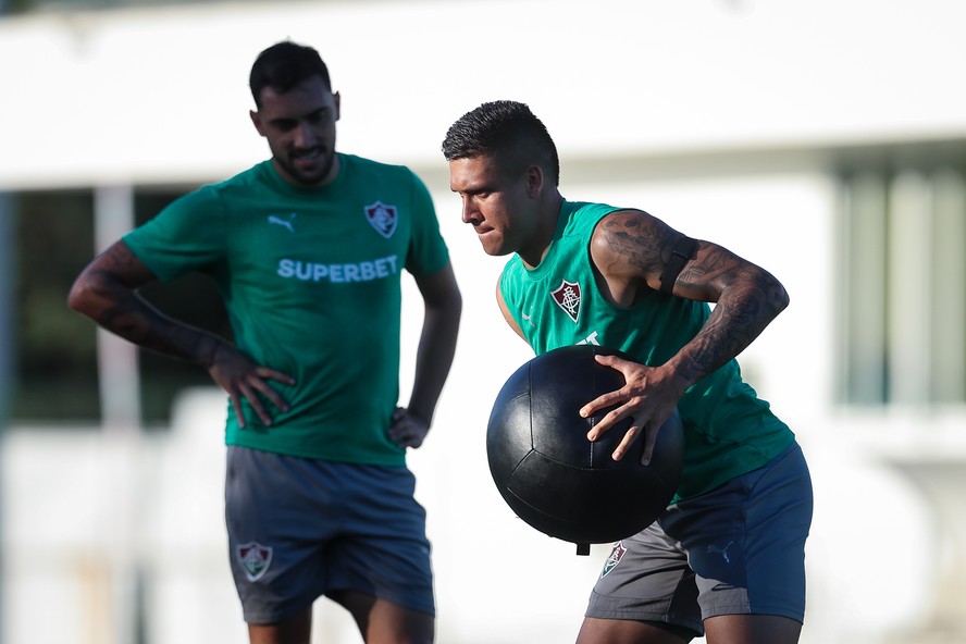 Concorrentes? Millán faz exercício sob olhares de Freytes no CT do tricolor — Foto: Marcelo Gonçalves / Fluminense FC