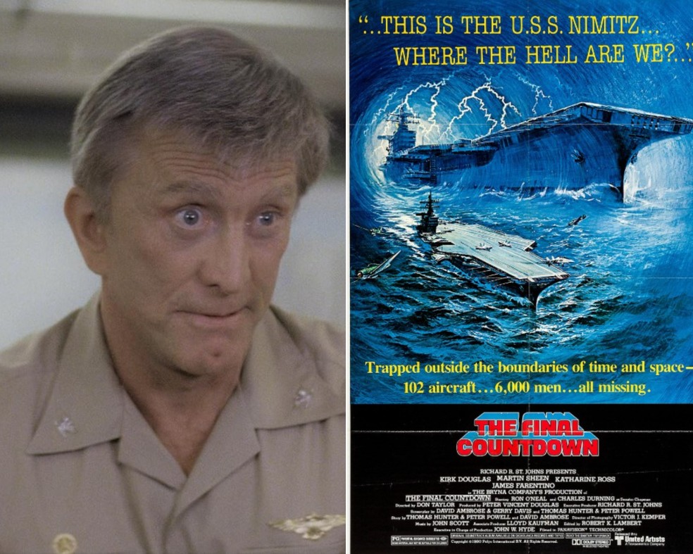 Kirk Douglas como o Capitão Matthew Yelland,protagonista de "Nimitz,de Volta ao Inferno"; à direita,o pôster do filme — Foto: Reprodução: IMDB