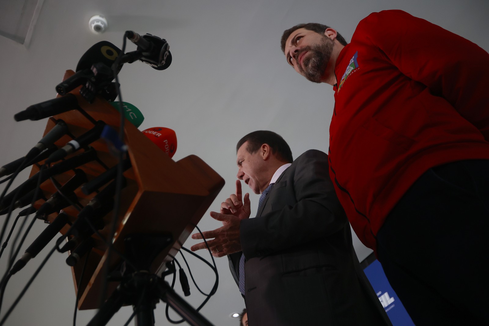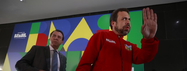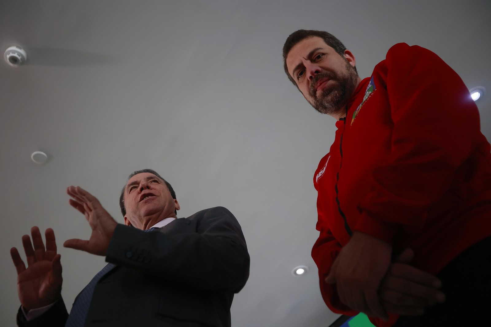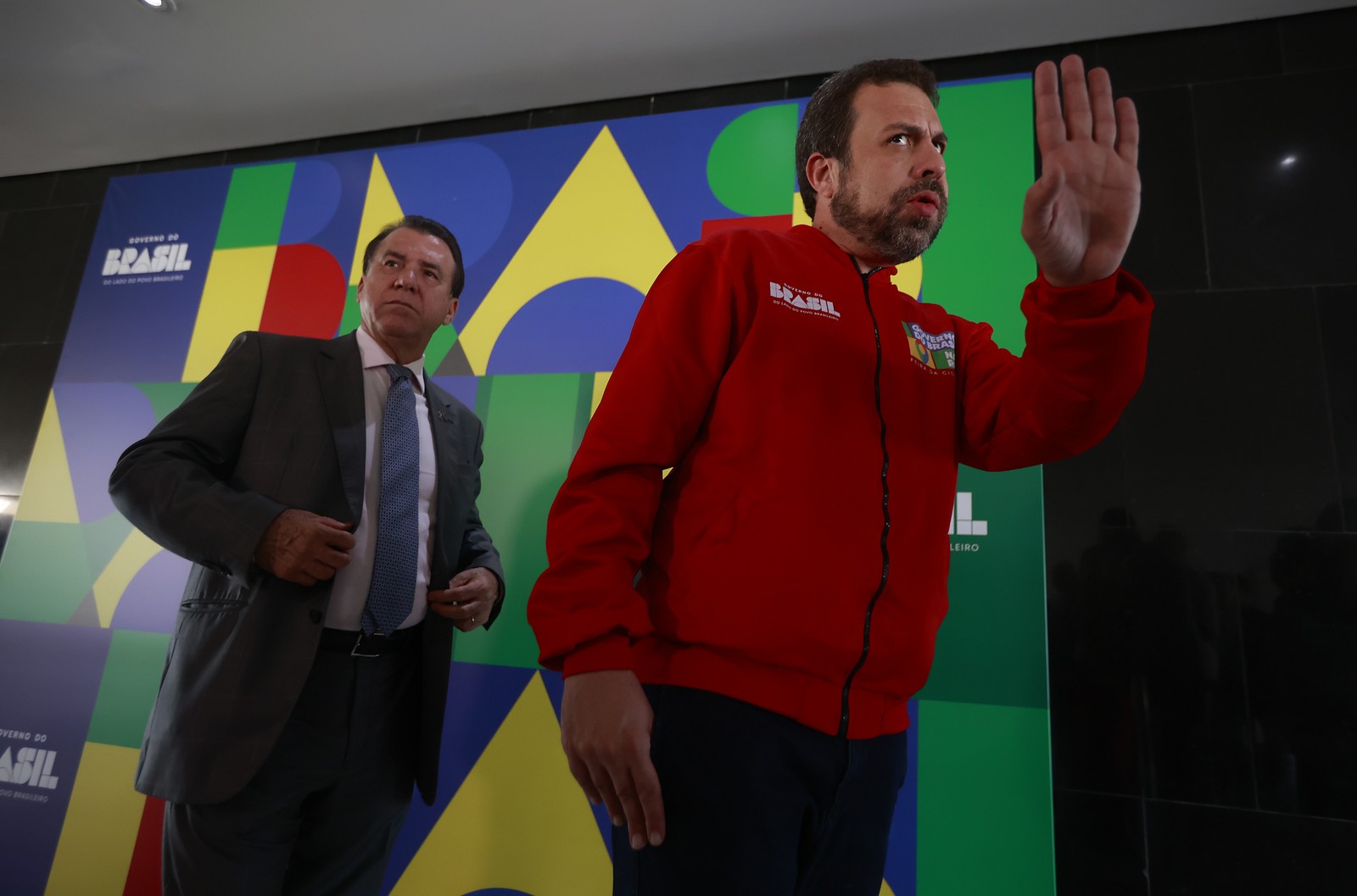 Ministros Luiz Marinho e Guilherme Boulos falam a respeito do projeto da Escala de trabalho 6x1,no Palácio do Planalto — Foto: Cristiano Mariz/Agência O Globo