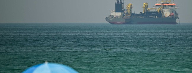 Navio comercial visto da costa de Dubai em meio ao fechamento do Estreito de Ormuz — Foto: AFP