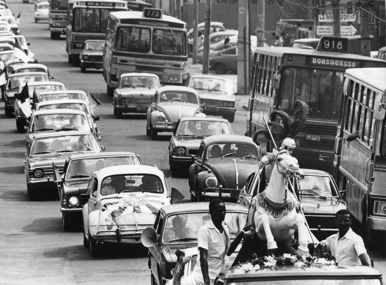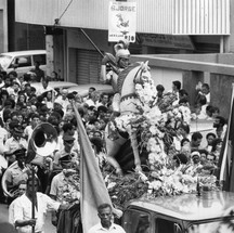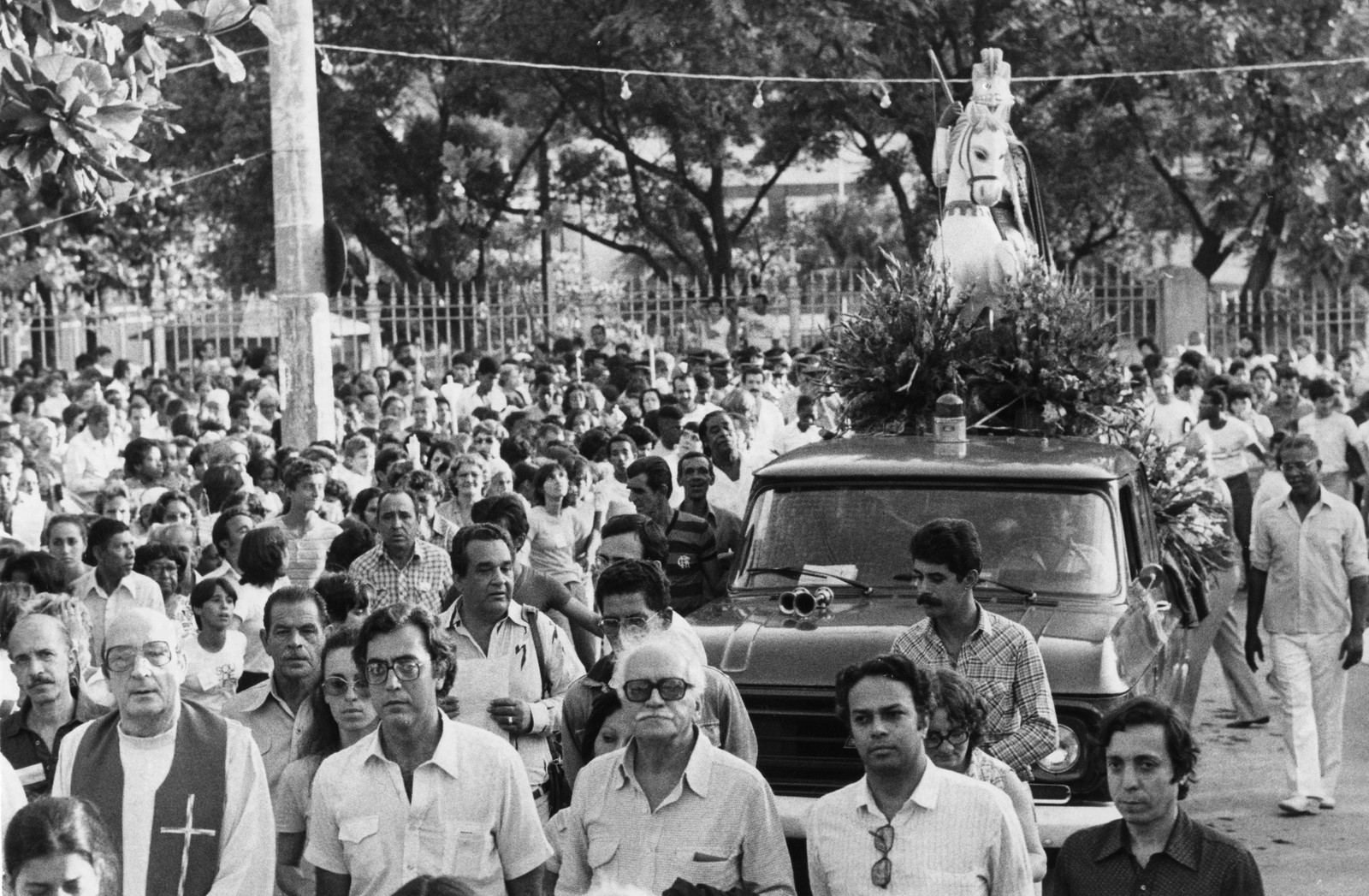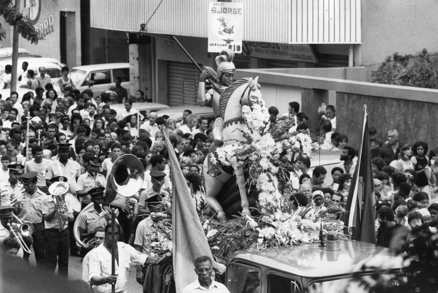 Procissão de São Jorge em Madureira,em 1980. A imagem de São Jorge é levada em carro aberto pelo bairro e os fiéis acompanham a carreata — Foto: Paulo Moreira / Agência O Globo