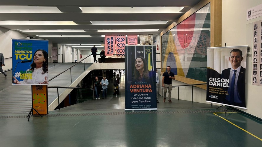 Corredor da Câmara com posters dos candidatos Soraya Santos (esquerda),Adriana Ventura (centro) e Gilson Daniel (direita) a uma vaga ao TCU — Foto: Letícia Pille